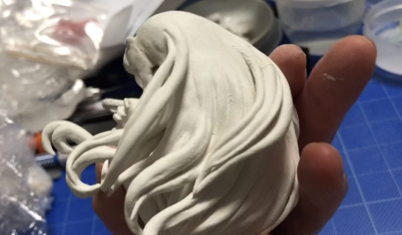 5・ボリュームを出すため粘土を盛って髪になじませる